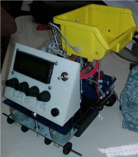 O protótipo possui ainda uma pequena caçamba que utiliza sensores infravermelhos em uma configuração diferente da que é usada no sensor seguidor de linha, capaz de identificar a presença ou não de carga em seu interior.